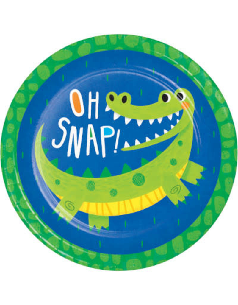 Our Alligator Birthday Party Paper Plates are perfect for party guests who are ready to chop on your yummy party treats! The sturdy plates measure 9" in diameter, a great size for serving a meal or a variety of snacks. They feature a toothy-yet-friendly alligator; bright green, blue, and yellow hues; and fun "OH SNAP!" messaging. Check out the rest of our Alligator Birthday Party supplies to complete the look at your celebration. Sold 8 plates per package, grab yours today!