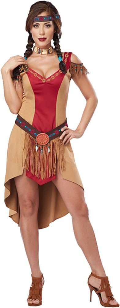 Our Adult Eye Candy Native Beauty Costume comes complete with the Red and Beige Dress with Fringing, Patterned Belt and Matching Headband.