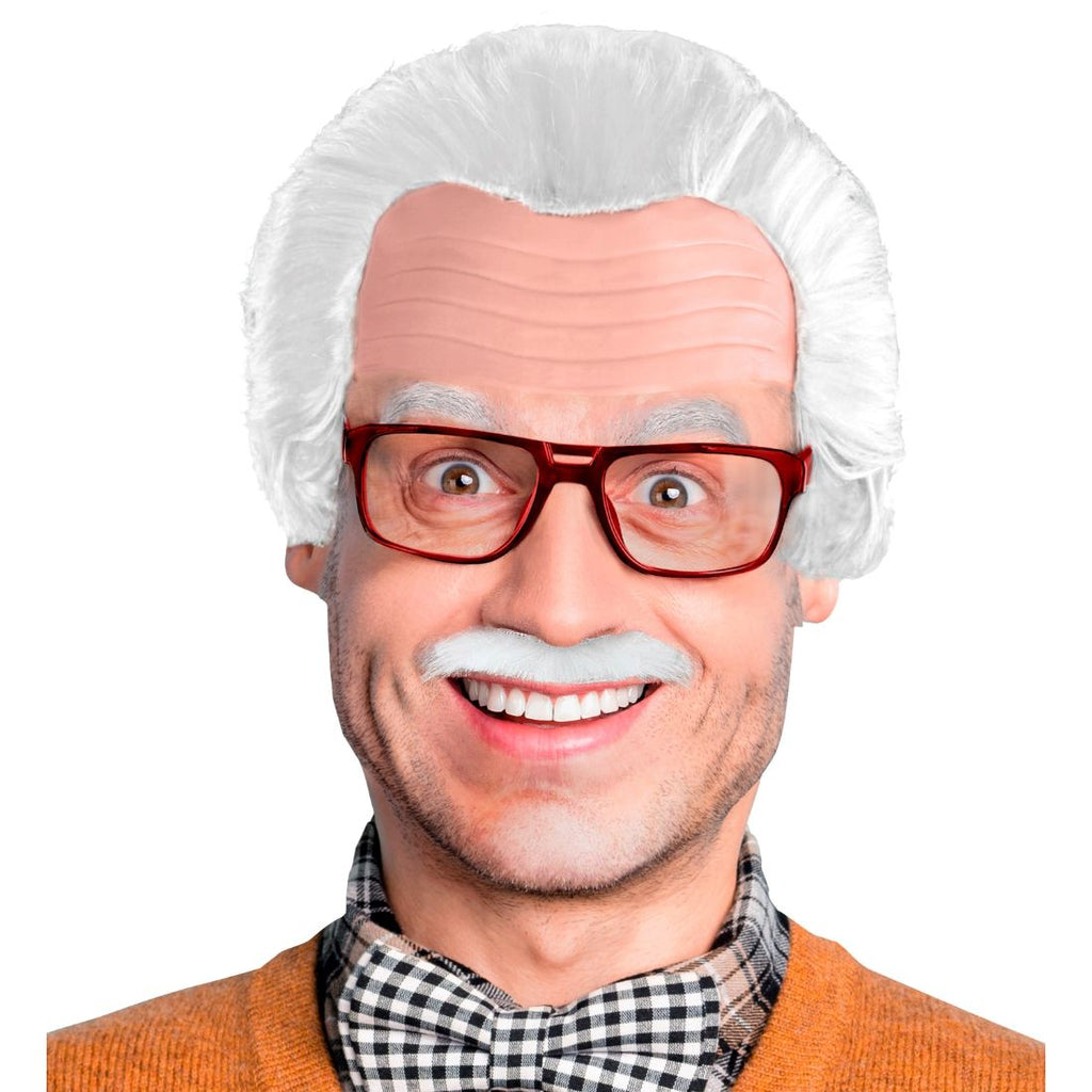 Grandpa Headpiece With Moustache & Glasses. With this kit, the Widmann company, transform yourself into an old man in the blink of an eye. The synthetic hair wig is very easy to care for and can be worn without having to style the body. The wig is not only suitable for your grandpa costume, but also perfectly highlighted in combination with a teacher or scientist costume