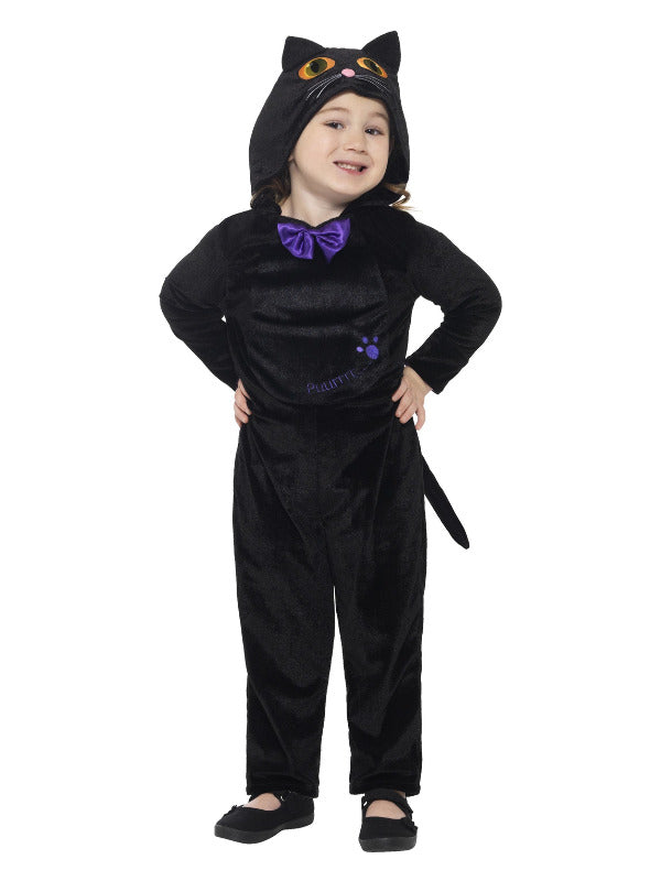 Cat Toddler Costume, Black, with Hooded Jumpsuit & 3D Printed Eyes This Toddler Cat Costume is perfect for Halloween, animal and themed fancy dress parties. This costume is a black hooded jumpsuit with 3D printed eyes, for a fuss free but effective costume.