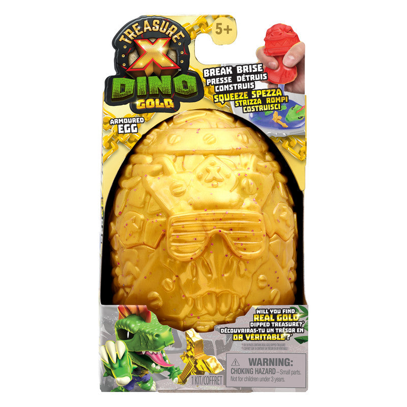 Treasure X Dino Gold is back with all new Dinos to discover and new treasures to find! Check out the amazing Dino Gold Armored Egg! This amazing gold colored egg has an adventure waiting to happen inside! When your child breaks open the gold egg, they will find a squishy Dino. When they squeeze all the ooze out of the Dino, they'll find all the parts of a Treasure X Dinosaur, each with their own bling and golden weapon.