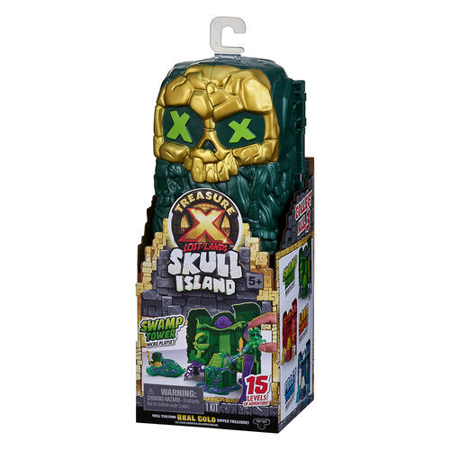 The Treasure X Lost Lands Skull Island Swamp Tower has 15 levels of adventure for kids to discover. Treasure X is going small in a BIG way! Its Micro Sized meets Mega Adventures! Kids can discover a whole new world of adventure, mystery, and treasure hunting with NEW Micro Figures in the Treasure X Swamp Tower! Boys and girls can explore Skull Island and search for real gold dipped treasure in this epic Tower! Throughout their journey, kids will discover 2 Micro Sized Figures, Stump & Toad and reveal the temples hidden secrets whilst dodging its traps in the hunt for Real Gold Dipped Treasure! Can they escape the swampy ooze, survive the bridge, grab the treasure and slide out alive? 1 in 12 packs includes real gold dipped treasure. There are 3 different Treasure Tower playsets, each with exciting thrills plus 6 exclusive characters for kids to collect! Collect them all. The Treasure X Lost Lands Skull Island Treasure Tower Pack is full of micro figures and mega adventures!
