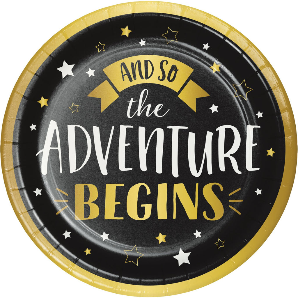 Invite everyone over to celebrate the graduate with help from our Grad Adventure Paper Plates. These premium-strength, 9" plates feature a black, white, and metallic gold look. They feature stars and "And so the adventure begins" text.