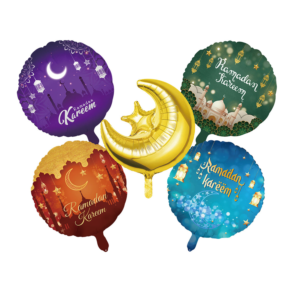 Ramadan Kareem Foil Balloons Set. Size: 18'' for round shape; 19''x22'' for moon shape. Perfect decoration for EID celebration.