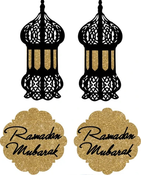 Hang these medallions up as decoration or use them on gifts. You get two lantern medallions and 'Ramadan Mubarak' cut out medallions.
