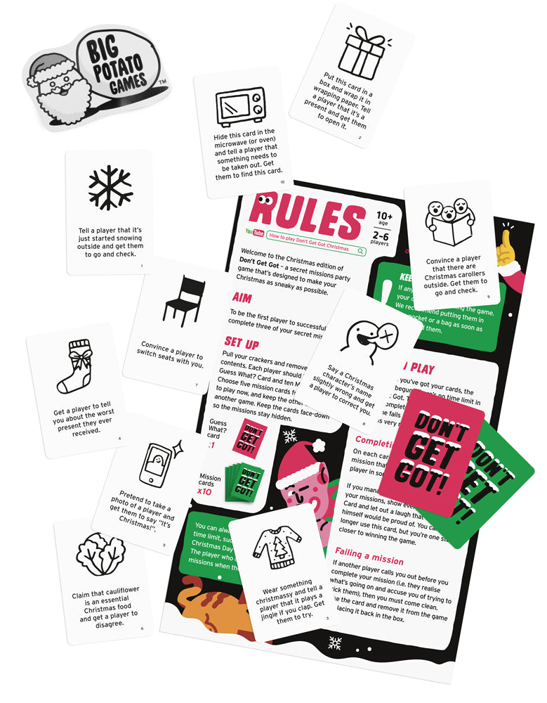 Don’t Get Got 12? Cracker - Add an extra layer of fun to your festive celebrations with our Big Potato Don’t Get Got Crackers! In each set of crackers, not only will you find the traditional hat, snap, and joke/motto, but also a selection of Don’t Get Got playing cards. This exciting addition brings a new level of entertainment for the whole family.