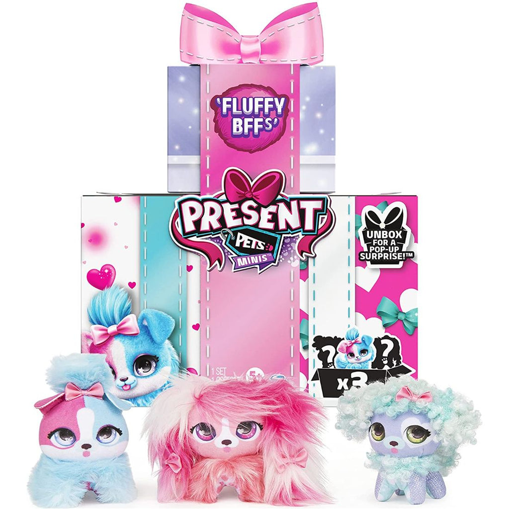 Experience a pop-up surprise with Present Pets Minis: adorable plush pets with an exciting reveal! Waiting inside every Present Pets Minis gift box is a sweet 3-inch pet with a collar matching its style, an adoption certificate, a doghouse and a sticker sheet. You won’t know which Present Pets Mini you’ll get until you pull the tab on the box! Lift the tab and watch as the box transforms and pops open from a gift into a super cute doghouse for your pet. The top of the box becomes a roof, and the door opens to reveal your soft and cuddly mystery pet! After unboxing, find out your pet’s personality by checking the symbol on the collar – every collar has one of two possible icons on it, like an artist’s palette, crown, music note and more. Once you meet your Present Pets Mini, fill in the adoption certificate with your pet’s birthday and give your new friend a special name. Then, customize the doghouse with the stickers and play with your pet or display it inside! Each Present Pets Mini has a unique doghouse with graphics matching their personality! Add all 10 Present Pets Minis stuffed animals to your collection (each sold separately) and discover all of the pet BFFs: Beach and Sporty, Candy and Princess and more. Plus, you could even find the chase Snow Skier unicorn or Cosmo kitty pet in your gift box! To unwrap even more fun, look for the Present Pets Minis 3-Packs (each sold separately). Bring home your very own Present Pets Mini and unbox for a pop-up surprise!