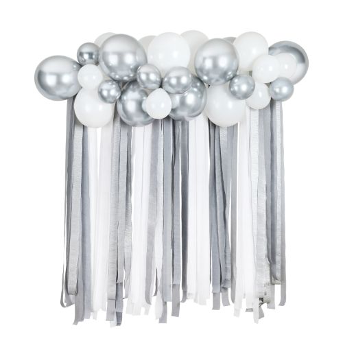 Set the scene with this stunning Silver Metallic Balloon & Streamer Backdrop!