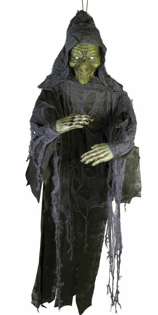 Just the decoration you need for your next haunted gathering! Witch has a green polyfoam head and hands with a draped gauzy black garment and poseable arms. The slightest breezy will waft her garment eerily back and forth. Simply hang up for immediate scares! 6 feet tall.